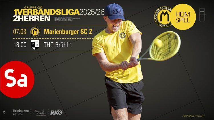 Am kommenden Samstag, den 7. März, um 18 Uhr empfängt die 2. Tennisherren den THC Brühl im Marienburger Sport-Club. Es ist das Saisonfinale in der 1. Verbandsliga – und es verspricht Spannung bis zum letzten Ballwechsel.