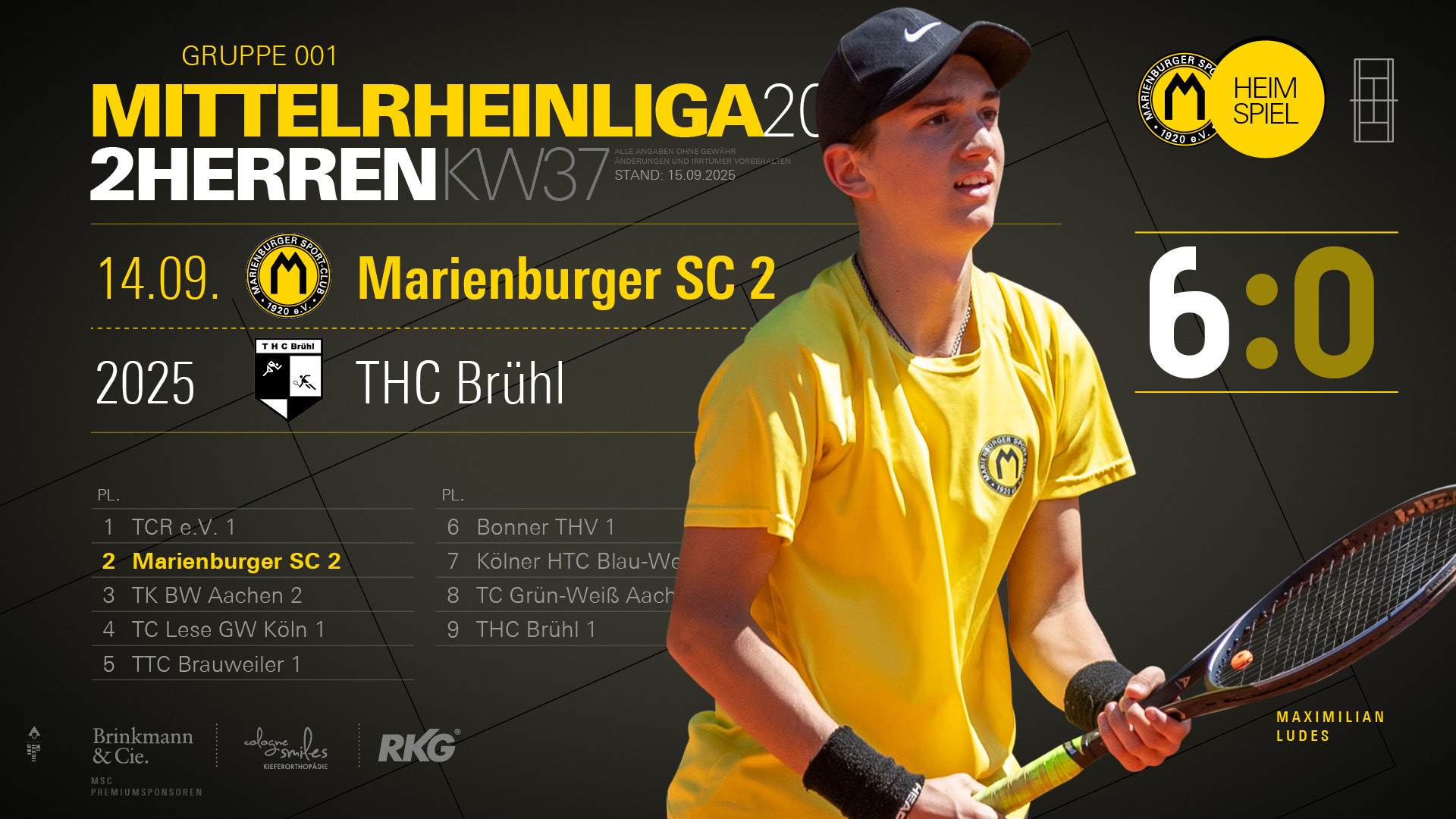 Die 2. Tennisherren des Marienburger Sport-Clubs hat die Sommersaison 2025 in der Mittelrheinliga mit einem herausragenden Ergebnis beendet. Gegen den THC Brühl lag die Mannschaft bereits nach den Einzeln uneinholbar mit 6:0 in Führung und setzte so den Schlusspunkt unter eine starke Runde. Mit sechs Siegen und nur zwei Niederlagen schloss die Zweite die Saison mit 12:4 Punkten als Vizemeister ab.