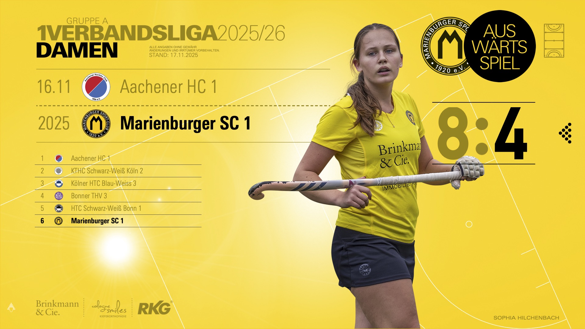 Mit dem 8:4 installierten sich die Aachener Damen an der Tabellenspitze, während die 1. Hockeydamen am ersten Spieltag in den Tabellenkeller rutschte. Die Treffer erzielten Sara Wißmann doppelt, dazu trafen Frieda Sauer und Leni Linden.